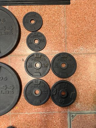 Equipo completo para entrenar en casa. - Banco de gimnasio con soportes para pesas. - Barra de pesas. - Juego de discos de pesas de diferentes tamaños y pesos. - Esterillas protectoras para el suelo. - tengo también pelotas de pilates y cosas varias que no están en las fotos si las quieren. Quiero quitarme esto de casa