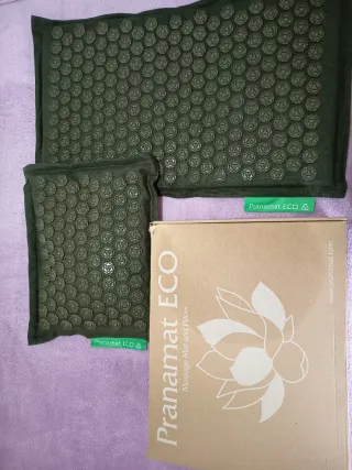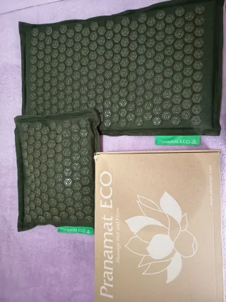 Esterilla de acupresión de color negro con almohada. - Diseño con múltiples puntos de acupresión. - Almohada a juego incluida. Sin usar, precintado. Me regalaron otro en morado y me gusta más