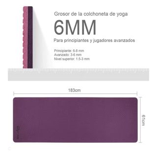 Esterilla de yoga o pilates en color morado con correa para transportar Cuenta con una superficie antideslizante para mayor seguridad. - Material: TPE ( elastómero termoplástico) - Fácil de transportar con correa incluida. - Dimensiones: 183 cmx 61 cm. - Grosor 6 mm - 950 gramos