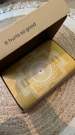 Esterilla de acupresión y masaje de la marca Shakti. El diseño presenta un patrón geométrico central y el nombre de la marca repetido en los bordes. - Nunca usada - Color dorado. - Incluye caja. A recoger cerca de francesc macia.
