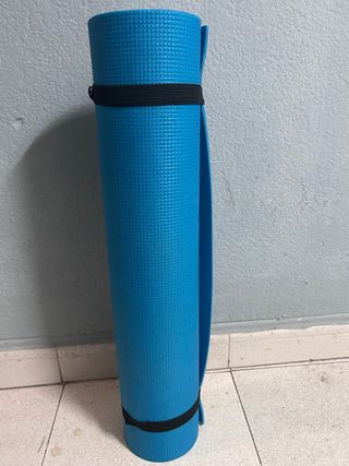 Esterilla enrollable de color azul, ideal para practicar yoga o ejercicios. - Textura antideslizante. - Incluye cintas elásticas para sujetarla. - incluye funda