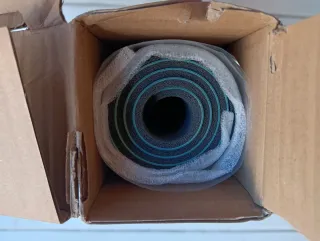 Se venden esterillas de yoga enrolladas, ideales para la práctica deportiva. - Disponibles en varios colores: azul, gris, morado, verde y rojo. - Cada esterilla está envuelta individualmente en plástico transparente.