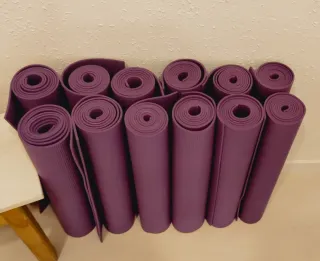 Pack de doce esterillas de yoga antideslizantes en color morado de la marca MUNDO YOGA Sin Phtalatos, sin colores AZO y sin BISPHENOL A (sustancias nocivas). Buena amortiguación y diseñada para resistir un uso intenso por su gran durabilidad. No han sido estrenadas, están impecables. Medidas 183 x 61 cm y 3-4 mm de grosor. Lavables a máquina a 40 grados. No centrifugar. La unidad son 18 €, pero si se compra todo el pack de 12 son 170 €. Disponibles a partir del día 23 de Marzo.