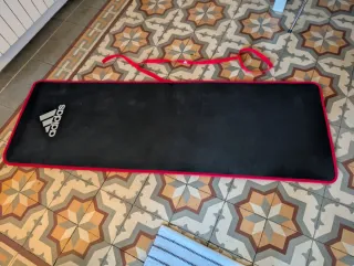 Esterilla de deporte Adidas en color negro. Cuenta con correas de sujeción rojas y un asa para facilitar su transporte. - Color: Negro - Correas: Rojas - Marca: Adidas Detalles GROSOR DE LA ALFOMBRILLA 10 MM Anchura 61 CM Longitud (en cm) 183 CM No envío, no a wrco a ninguna parte. Tiene uso pero sin ningún defecto.
