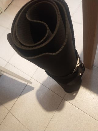 Esterilla de yoga enrollable de color negro, con su funda de transporte. - Esterilla de yoga de color negro - Esterilla de caucho, marca Kimjaly - Funda de transporte negra con cremallera y cordón. La esterilla en muy buena condición y la bolsa esta como nueva. #esterilla #yoga #fitness