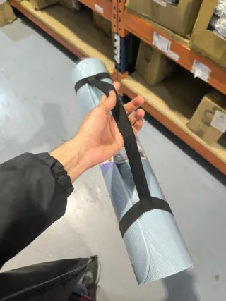 Esterilla de yoga enrollada en una funda. - Funda de transporte negra con cierre de cordón. - Malla transpirable en la parte central de la funda. - Base y parte superior de la funda en material negro.