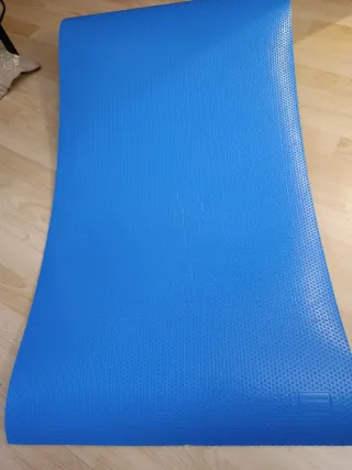 Esterilla de yoga enrollada, de color azul vibrante. Perfecta para tus sesiones de ejercicio. Usado muy pocas veces - Material texturizado para mayor agarre. - Diseño enrollable para fácil transporte y almacenamiento.