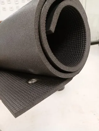 Se venden cuatro esterillas negras, ideales para yoga o ejercicio. - Material de espuma. - Textura antideslizante en una cara. - Acabado liso en la otra cara. - Incluye un ojal metálico en cada una.