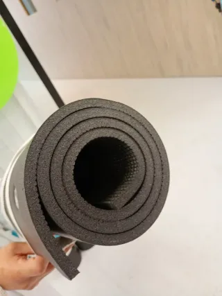 Esterilla de yoga enrollada, lista para llevar a tus clases o entrenamientos. Su color gris la hace discreta y elegante. - Incluye correa para facilitar su transporte. - Textura antideslizante para mayor seguridad.