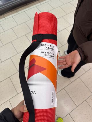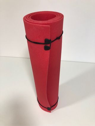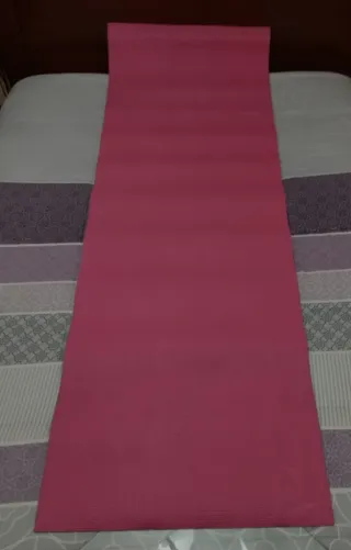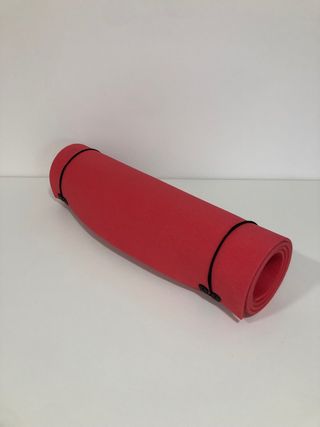 Esterilla de espuma para yoga o pilates. Es de color rojo y viene con dos cintas elásticas negras para sujetarla enrollada. Tiene alguna marca de uso pero está bastante bien. Mide 60x1,60.