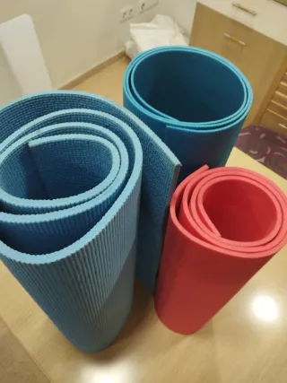 Conjunto de esterillas de yoga y pilates en varios grosores. Ideales para tus rutinas de ejercicio. - Esterilla azul grande. - Esterilla azul mediana. - Esterilla roja pequeña.