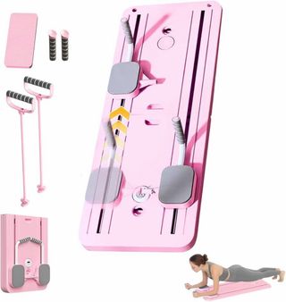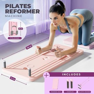 Máquina de Pilates Reformer plegable en color rosa. Incluye accesorios para un entrenamiento completo. - Diseño compacto y fácil de guardar. - Incluye dos asas de agarre. - Incluye dos rodillos. - Incluye una esterilla de ejercicio.