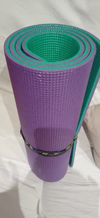Dos esterillas enrolladas, ideales para pilates o yoga. Son de color verde turquesa con detalles en morado. Se venden las dos unidades juntas, una sola 7€. - Material de espuma. - Cintas elásticas negras para sujetarlas.
