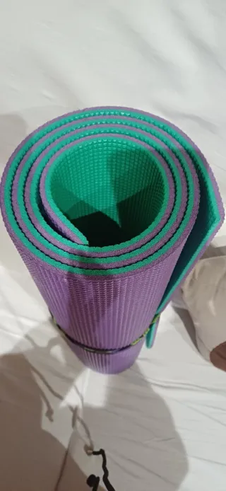 2 Esterillas de yoga, pilates y fitness en color morado. Incluye bolsa de transporte. - Material: Espuma. - Color: Morado. - Incluye bolsa de transporte de malla negra. - Viene con QR con ejercicios. Una de ellas precintada la otra solo se ha abierto. No se han usado.