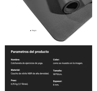 Esterilla de yoga, pilates o fitness. Es de color negro y cuenta con una funda para llevarla cómodamente. Ligera, lo que permite guardarla y transportarla fácilmente a cualquier lugar.