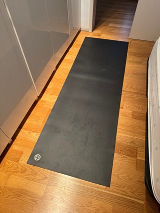 Esterilla de yoga de la marca Manduka en color negro. Ideal para la práctica de yoga y pilates. - Color: Negro - Marca: Manduka - Material: Caucho natural y poliuretano, y espeso No tiene olor ni nada! Solo unas rayas que se ven en la photo