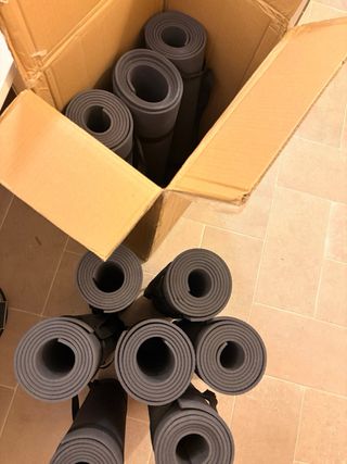 Pack de cuatro esterillas de yoga enrollables en color verde oscuro. Son ideales para practicar yoga, pilates o para usar como colchoneta de ejercicios. Solo usadas una vez - Material: Espuma. - Color: Verde. - Incluye correas de sujeción. A recoger en Bilbao