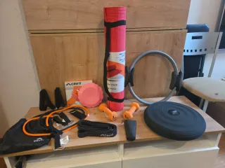 Conjunto de accesorios para practicar yoga, pilates y fitness en casa. Incluye varios elementos para complementar tu rutina de ejercicios. - Esterilla de yoga Crivit roja. - Aro de pilates. - Disco de equilibrio. - Dos mancuernas naranjas de 1 kg cada una. - Bandas elásticas de resistencia. - Bolsa de transporte negra. - 2 rodilleras. - Gomas con diferentes resistencias.