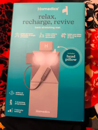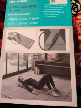 Esterilla masajeadora de la marca Homedics, diseñada para relajar y revitalizar la espalda. - Incluye almohada para la cabeza. - Cuenta con 3 cámaras de aire activas. - Ofrece 3 programas de estiramiento. - Dispone de 3 ajustes de intensidad. Esterilla masajeadora sirve también para pilates yoga etc etc
