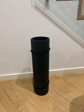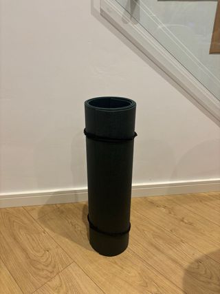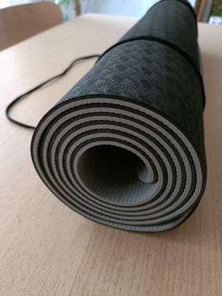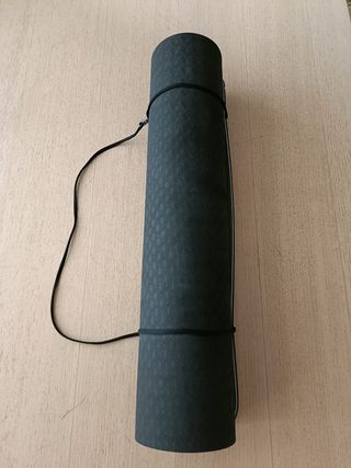 Esterilla de yoga y pilates en color negro. Ideal para tus rutinas de ejercicio en casa o al aire libre. - Material antideslizante. - Fácil de enrollar y transportar. - medidas 140 x 50 cm y ancho de 6,5 mm - Comprada en Decathlon.