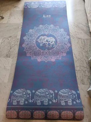 Esterilla/ colchoneta de yoga o pilates con un diseño llamativo de elefantes y mandala. Material velopelo, suave y antideslizante. Medidas 183*68cm Espesor 8mm - Diseño en tonos azules y morados. - Motivo central de elefante rodeado de mandala. - Serie de elefantes en la parte inferior. - Borde decorativo con motivos florales. - De estar plegada tiene unas líneas. Ver fotos.