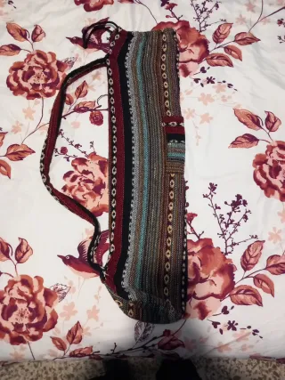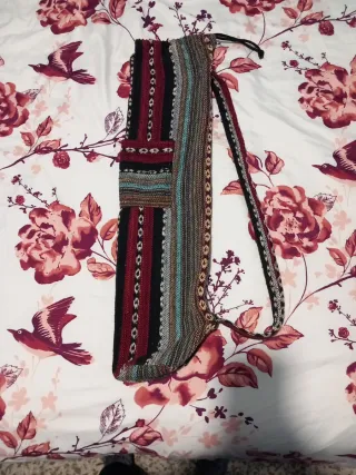 Práctica bolsa para transportar tu esterilla de yoga o pilates. Su diseño étnico y colorido la hace única. - Tejido resistente con estampado geométrico. - Cierre de cordón. - Correa ajustable para llevar al hombro.