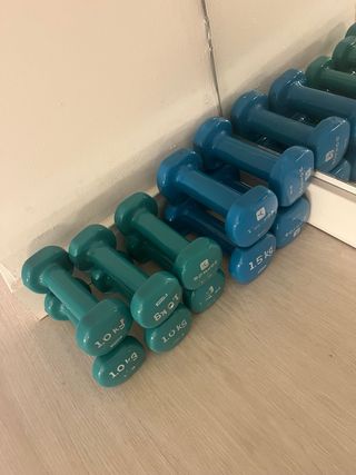 Lote de material deportivo para entrenar en casa. - Mancuernas de 1 kg (4 unidades) y 1.5 kg (2 unidades). - Rulo de pilates. - Esterillas de yoga/fitness.