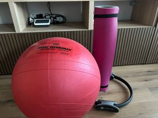 Conjunto de accesorios para entrenar en casa o al aire libre. Incluye un balón de ejercicio (55cm), una esterilla enrollable y un aro de pilates. - Balón de fitness de color rojo. - Esterilla de yoga/fitness de color rosa. - Aro de resistencia para ejercicios.