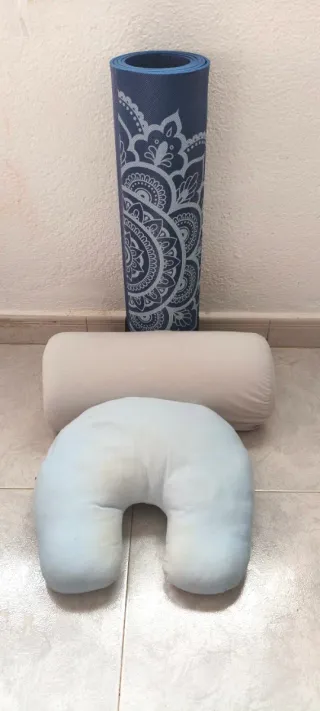 Esterilla enrollada con un diseño de mandala en tonos azules y blancos. Incluye un cojín cilíndrico beige y un cojín en forma de U. - Esterilla de yoga/pilates enrollada. - Cojín cilíndrico. - Cojín en forma de U.