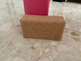 Esterilla de color rosa para practicar yoga o pilates en el suelo. Se vende junto con el bloque de corcho para yoga o ejercicio. Ideal para mejorar la estabilidad y el soporte en tus posturas. Comprado en Decathlon, marca Nyamba.