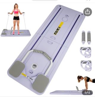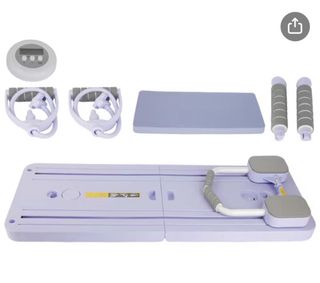 Tabla de pilates en color lila, ideal para ejercicios en casa. Incluye accesorios para complementar tu rutina. - Tabla principal plegable. - Dos asas de resistencia. - Una esterilla. - Dos rodillos.