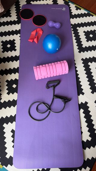Conjunto de accesorios para fitness y pilates, ideal para tus rutinas de ejercicio. - Esterilla de yoga/pilates morada. - Foam roller rosa. - Pelota de ejercicio azul. - Banda elástica roja. - Rueda de masaje morada. - Dos discos deslizantes negros.