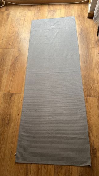 Cubre esterilla de Yoga en perfecto estado. Por un lado es como de toalla (color gris) y por el otro es antideslizante (color turquesa). Perfecta para cubrir la esterilla de yoga y no mancharla de sudor. Se pliega muy fácil para un transporte cómodo. Medidas: 183x61 cm.
