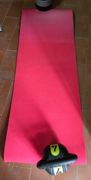 Esterilla de yoga y otros deportes resistente y antideslizante con correa de transporte. Medidas: 183 x 61 x 0,6 cm (largo x ancho x grosor) Esterilla de 6 mm y un peso de 700 gr aprox. Adecuada para pilates, hiit, yoga, gimnasia y otros deportes. Poco uso, muy cuidada. Menos de un mes de uso y siempre usada sobre suelo recién fregado y nunca se ha pisado con calzado, solo calcetines. La vendo por no usarla y por motivo de mudanza. Tiene marcas normales de uso y una pequeña marca que ya venía cuando la compré, creo que debido a la empresa de mensajería, pero es muy pequeña y no afecta para nada a su uso. Ver últimas fotos.