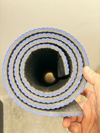 Esterilla de yoga y pilates en color negro. Ideal para tus rutinas de ejercicio en casa o al aire libre. - Material antideslizante. - Fácil de enrollar y transportar. - medidas 140 x 50 cm y ancho de 6,5 mm - Comprada en Decathlon.
