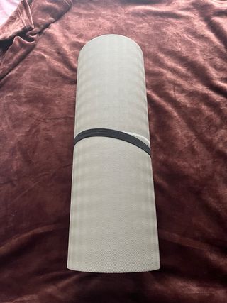 Esterilla enrollada, ideal para practicar yoga o ejercicios en casa o al aire libre. Viene en su embalaje original. - Color gris. - Textura antideslizante.