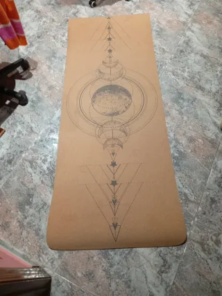 Esterilla de yoga enrollada, ideal para practicar en casa o llevar a clases. Su diseño es sencillo y funcional. - Material de corcho. - Símbolo de chakra impreso en rojo. Se limpia muy fácil cn vinagre se oscurece del uso.