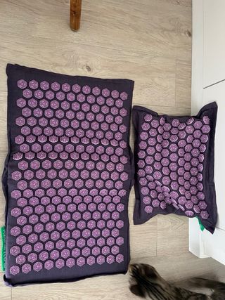 Set de esterilla y cojín de acupresión en color morado. - Diseño hexagonal de los puntos de acupresión. - Funda exterior de tela. - Incluye esterilla, cojín con su respectiva bolsa