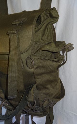 Mochila Combate mediados años 80. Nueva. Procede de una antigua colección de efectos militares, de ahí el perfecto estado. Sin elementos metálicos. Verde oliva OTAN. Es la primera no diseñada expresamente para el CETME C. Tiene dos bolsillos laterales. Cuenta con múltiples cintas y enganches de lona rígida con trabilla y cuatro de elástico. Permitían colgar esterilla, la mitad tienda ANETO, colchoneta y saco de dormir y demás impedimenta. Compartimento interior ampliable, cuenta con cinto ajustable. Fue usada en la Legión, COE y resto de Unidades. Muy dura y ligera, 917gr. Ideal para atrezo, escenografía, excursiones, acampadas...