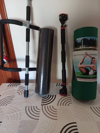 Se vende equipamiento de gimnasia compuesto por una barra de puerta para hacer abdominales,una esterilla nueva un rulo para relajar los músculos que esta nuevo a estrenar y una barra de ejercicios todo ello ideal para mantenerse en forma sin salir de casa,todo ello en muy buenas condiciones y nuevo a estrenar. Atiendo también por WhatsApp y llamadas al teléfono 624114470. Precio 25€