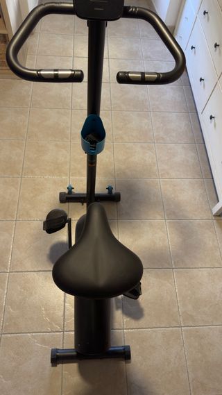 Bicicleta estática Domyos modelo 140, ideal para entrenamientos en casa. Su diseño compacto la hace perfecta para cualquier espacio. - Color negro. - Soporte para botella integrado. - Pantalla digital