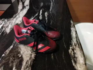 Zapatillas de fútbol para niño Adidas Predator. - Combinación de colores negro y rojo. - Marca Adidas. - Cierre con cordones.
