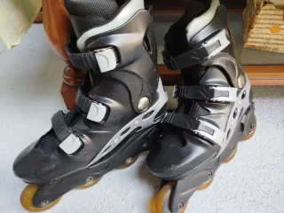 Patines en línea de color negro y gris, ideales para patinar. Bastante usados, ideales para iniciarse o probar. Precio negociable - Cierre de velcro y hebilla. - Ruedas de poliuretano.