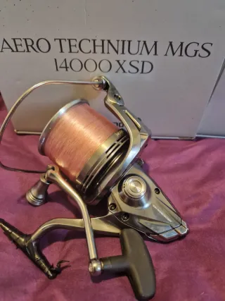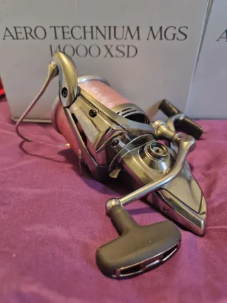 Carrete de pesca Shimano Aero Technium MGS 14000 XSD bobina de 45mm , más bobinas disponibles en mi perfil ,originales y mv soools cónicas. Se vende con casquillo y araña. Impecable, sin un rasguño. Incluye funda neopreno, arandelas carbono freno y pieza para cambiar de lado la manivela del carrete. - Diseño plateado y negro. - Bobina con hilo de color rosa. - Mango de recuperación negro.