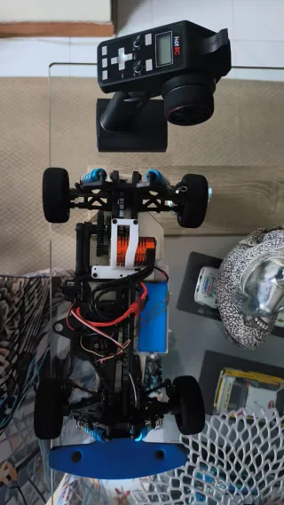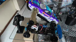 Coche radiocontrolado de competición a escala 1/10, modelo Rayprig. - Carrocería con diseño deportivo en morado y turquesa. - Incluye mando a distancia. - Chasis con componentes visibles. - motor f540 4730kv - variador 60A regalo ruedas y dos baterías COCHE MUY MUY RÁPIDO solo se usó dos veces PRECIO NO NEGOCIABLE YA ES UN REGALO