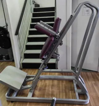 Máquina de entrenamiento para trabajar las piernas. Ideal para rutinas de fuerza. - Estructura metálica resistente. - Asiento y respaldo acolchados en color morado. - Plataforma para apoyar los pies.