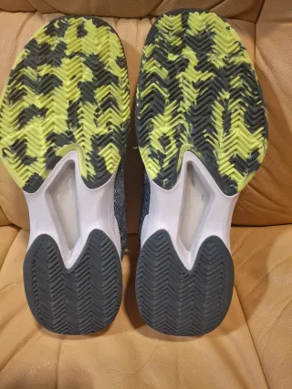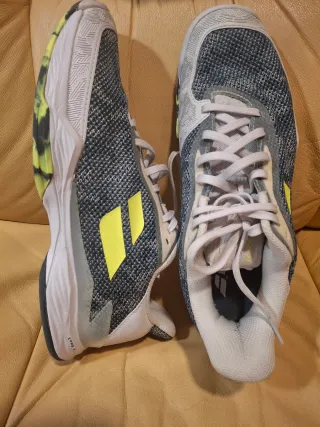 Zapatillas deportivas de la marca Babolat, ideales para pádel o tenis. Presentan un diseño moderno y llamativo. - Combinación de colores gris y amarillo. - Tejido transpirable en la parte superior. - Suela diseñada para un buen agarre. Usado por un niño en una ocasión. Talla como 40. 26,5 cm!!! Pvp.110 eur. Hago envio.
