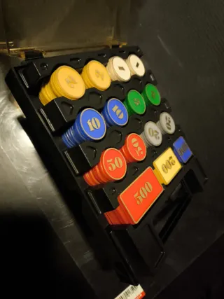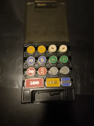 Conjunto de fichas de diferentes valores para juegos de mesa o póker, presentado en un práctico estuche. - Fichas de colores variados: amarillo, azul, verde, rojo, gris y blanco. - Valores visibles: 1, 10, 20, 50, 100, 200 y 500. - Estuche organizador de plástico negro.