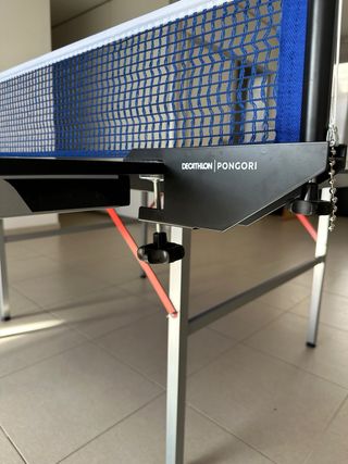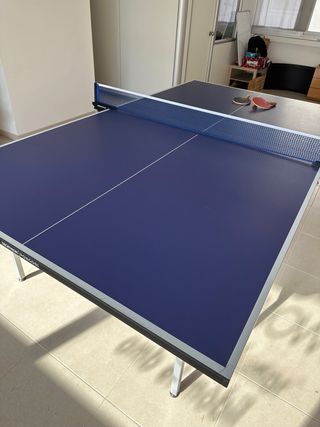 Mesa de ping pong de color azul, lista para jugar. Incluye dos palas y pelotas. - Patas plegables para fácil almacenamiento.