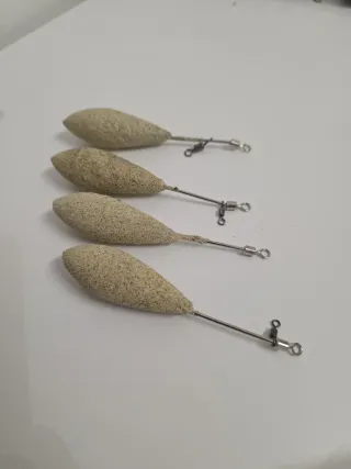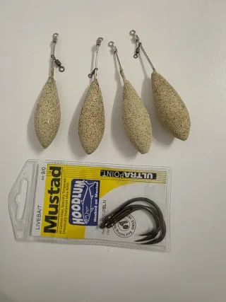 Set de plomos de pesca con forma de lágrima y anzuelos. - Incluye 4 plomos de 120g. - Anzuelos Mustad Hoodlum, tamaño 9/0. - Plomos con acabado texturizado y giratorio. - Anzuelos de acero de alto carbono, templados y afilados.